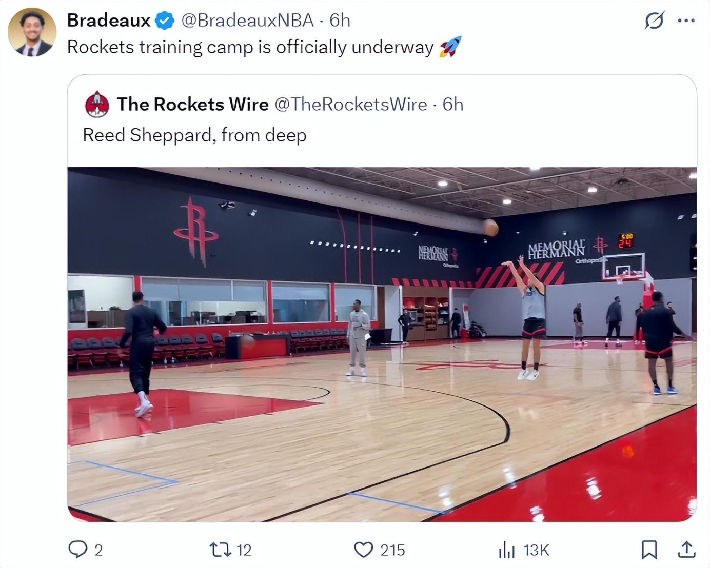 火箭記者Bradeaux曬出了謝潑德合訓後的加練,謝潑德連續命中兩個超遠三分球。雖然上賽季謝潑德的三分球命中率並不高,但他實際上是NCAA歷史最偉大的三分手之一,如果新賽季謝潑德能將三分命中率提升到38%,火箭的空間將繼續擴大。