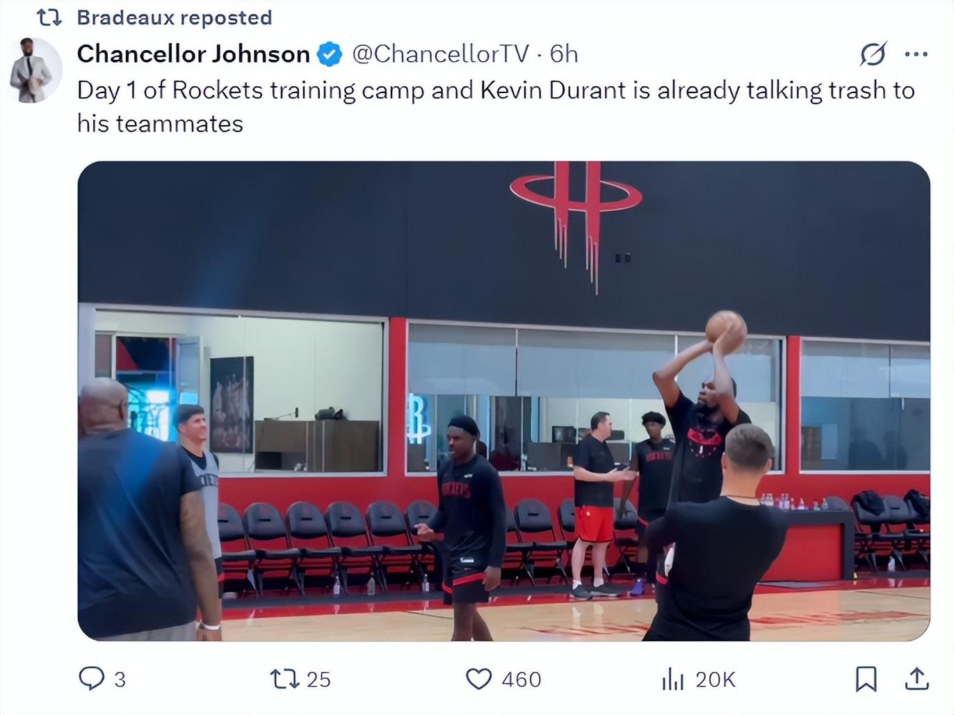 還有火箭記者透露,凱文-杜蘭特在訓練營的第一天就開始噴垃圾話了,他朝着助教與隊友狂噴垃圾話。正如此前亞當斯、布克等人所說的KD對自己人也噴垃圾話。