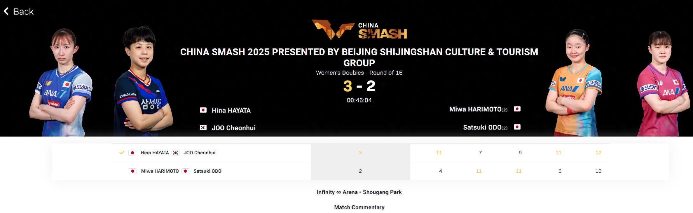 北京時間10月1日,WTT北京大滿貫女雙1/8決賽,張本美和/大藤沙月2-3不敵早田希娜/朱芊曦,五局比分:4-11、11-7、11-9、3-11、10-12。張本美和/大藤沙月在大比分0-1落後的情況下連扳兩局反超,但後面兩局又被早田/朱芊曦碾壓,最終張本/大藤逆轉失敗止步16強。