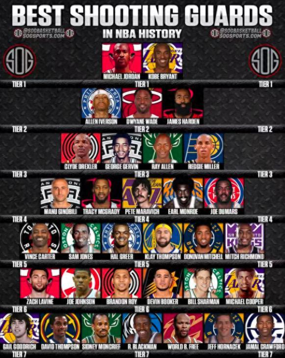 喬丹與科比並列第一檔SG沒有太大爭議,但有些球迷會覺得喬丹作爲歷史第一人,6MVP+6FMVP不是科比能相媲美的,喬丹獨一檔更合理,然後科比自己排在第二檔,分爲八個檔次似乎更好一些。