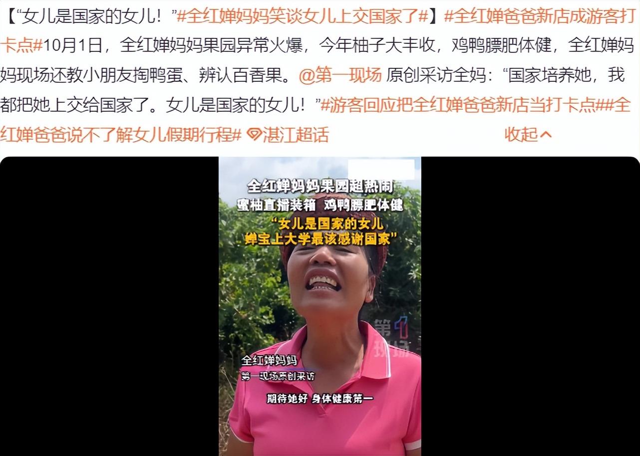 近期,全紅嬋媽媽的果園異常火爆,很多遊客來進行打卡,第一現場也去採訪了全紅嬋的媽媽,全媽說道:全紅嬋能讀大學要感謝國家,國家培養她,我們就把她上交給國家了,女兒是國家的女兒。