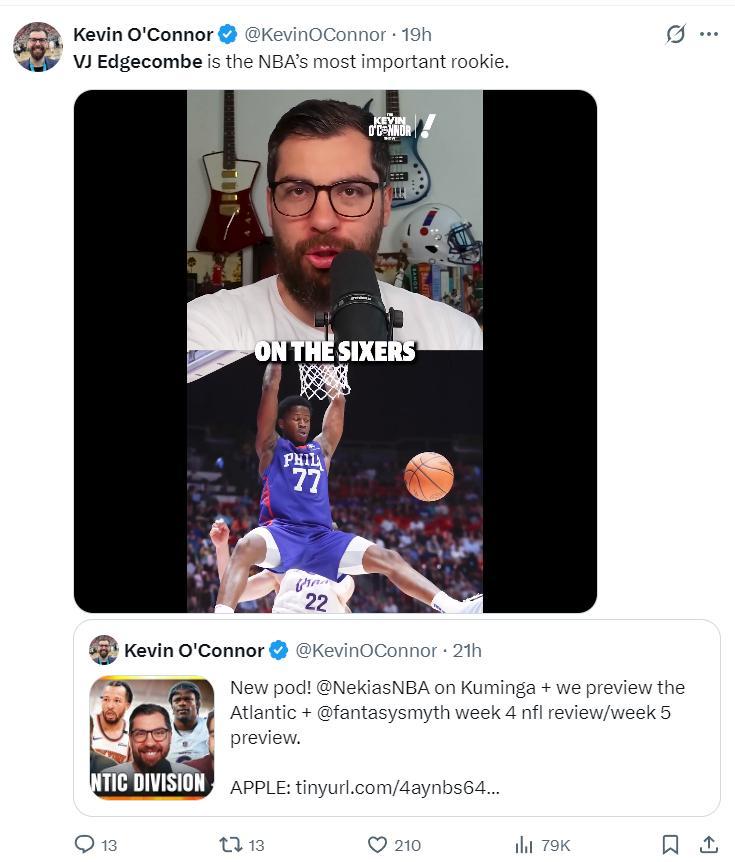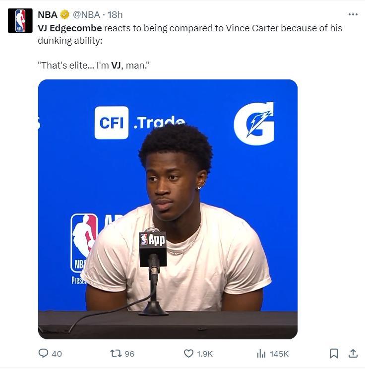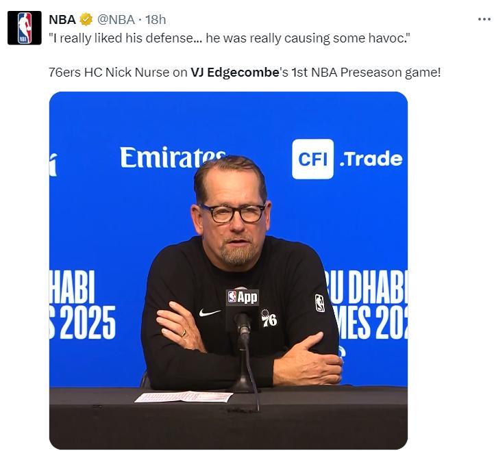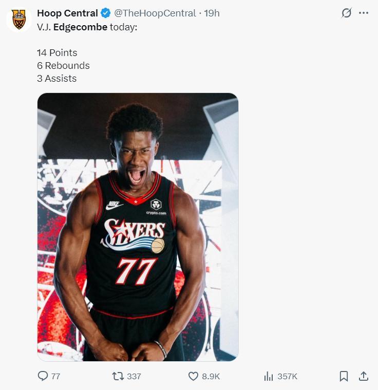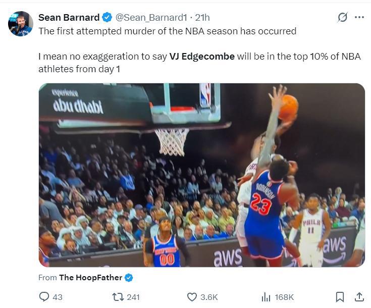 費城記者Sean Barnard寫道:NBA新賽季的第一場比賽就險些出現了逆天隔扣,我毫不誇張的說,埃奇庫姆會成爲NBA天賦排名前10%的球員。