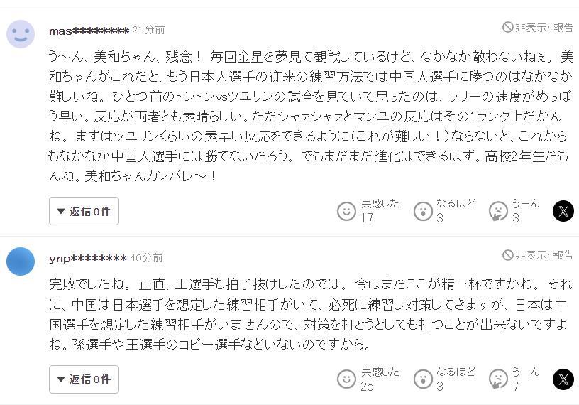 2.真是慘敗啊,老實說王曼昱選手肯定對日本選手很失望吧,對陣張本美和、早田希娜都還沒有盡全力比賽就結束了。中國選手對日本選手都有針對性策略,但日本選手卻沒有什麼好辦法根本無法取勝,在訓練中日本也沒有可以模仿孫穎莎、王曼昱選手打法的球員;