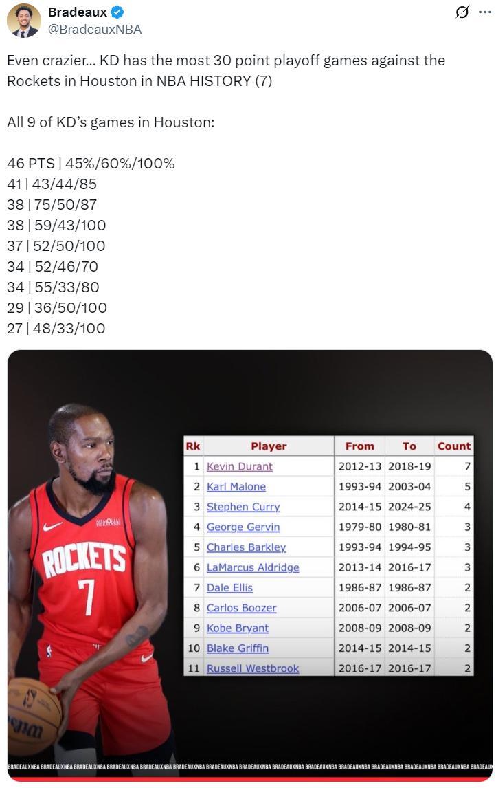 火箭記者Bradeaux曬出杜蘭特來到休斯頓打的9場季後賽比賽,這9場比賽有7場得分超過30+,其中還有兩場超過40+,最恐怖的一場46分,命中率45%,三分命中率60%,他是NBA歷史季後賽在休斯頓單場30+最多的球員。
