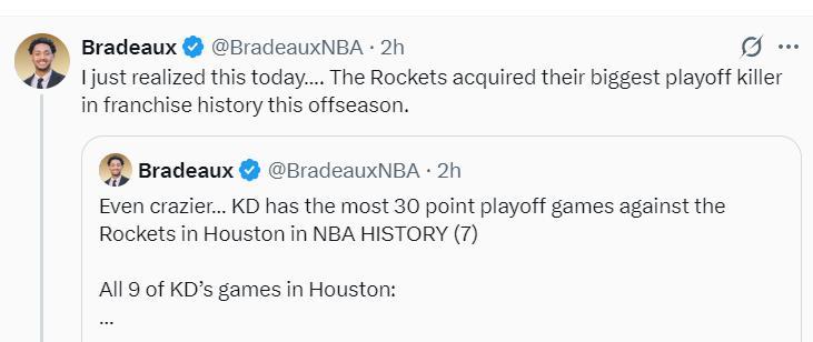 他繼續寫道:我從今天才意識到,這個休賽期火箭得到了隊史季後賽最致命的殺手。
