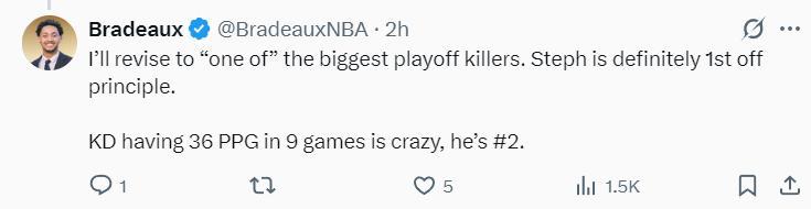 隨後他又寫道:我將杜蘭特修改爲‘季後賽最大的致命因素之一’。庫裏絕對是首要的,但杜蘭特9場比賽場均能拿36分,這太瘋狂了。
