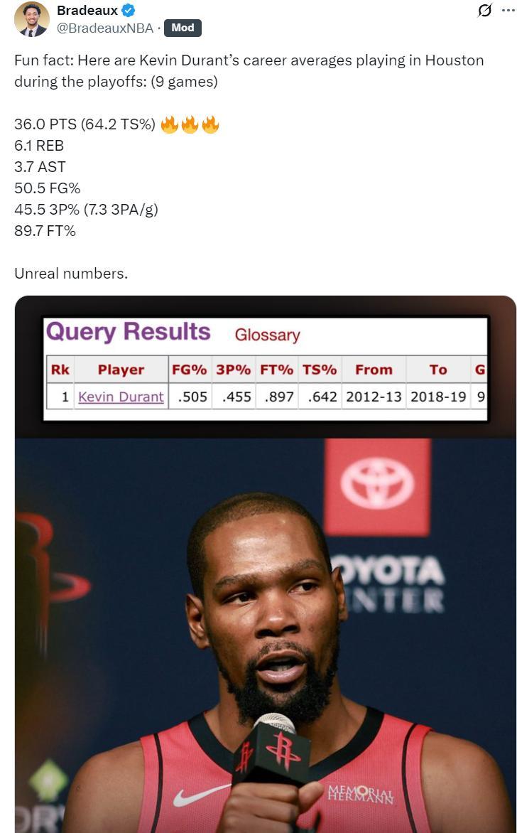 KD的球迷組織轉推後寫道:KD在休斯頓參與的季後賽場均36+6+4,他在休斯頓的整個職業生涯中,或許能打出自己迄今爲止最出色的賽季表現。