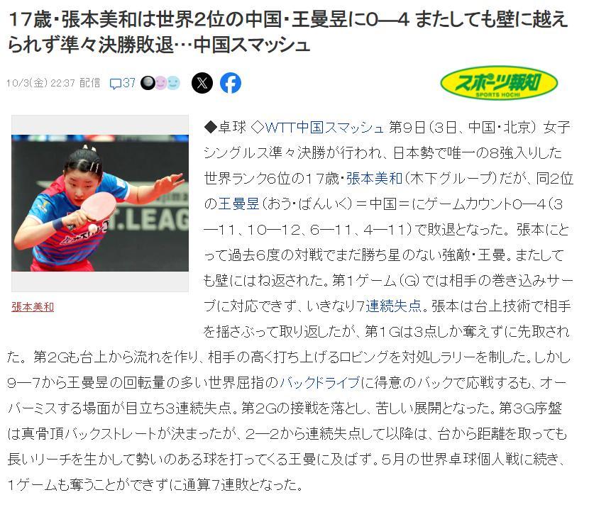 賽後日本媒體非常之沮喪,文章標題是:17歲的張本美和在面對世界第二的王曼昱時又吞下一場慘敗,0-4無緣半決賽。