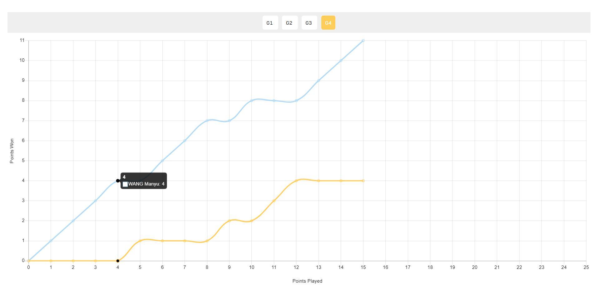 暫停后王曼昱繼續取分4-0領先,張本美和艱難拿到1分,王曼昱又拉開到8-2,從這裏張本美和就已經無力迴天,最終王曼昱11-4輕鬆取勝,王曼昱4-0橫掃張本美和,職業生涯張本美和與王曼昱交手7次全部落敗,王曼昱面對日乒一姐豪取7連勝。