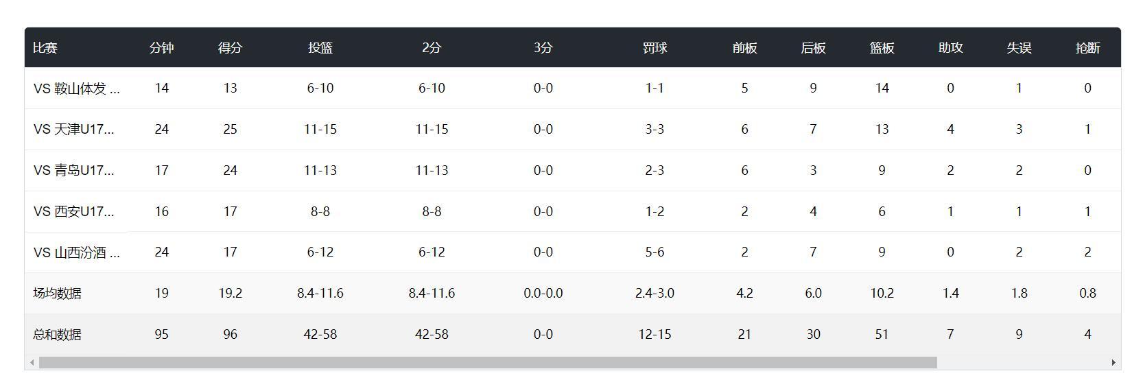 可以看到他登場的比賽只有兩場24分鐘其餘的場次都不足20分鐘,場均19分鐘,拿到19.2分10.2籃板1.4助攻0.8搶斷1.4蓋帽,命中率72.4%,罰球命中率80%,他除了欠缺三分投射外進攻端沒有什麼軟肋。