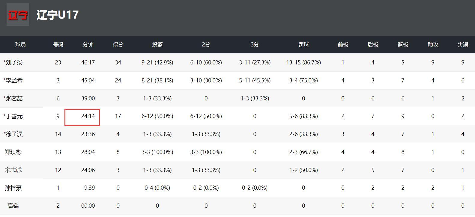 這場比賽遼籃的勝利是依靠劉子揚、李孟希、於善元三人,劉子揚46分鐘21中9+三分11中3拿到34分9助攻5籃板9失誤,李孟希45分鐘21中8+三分11中5拿到24分7籃板4助攻6失誤;