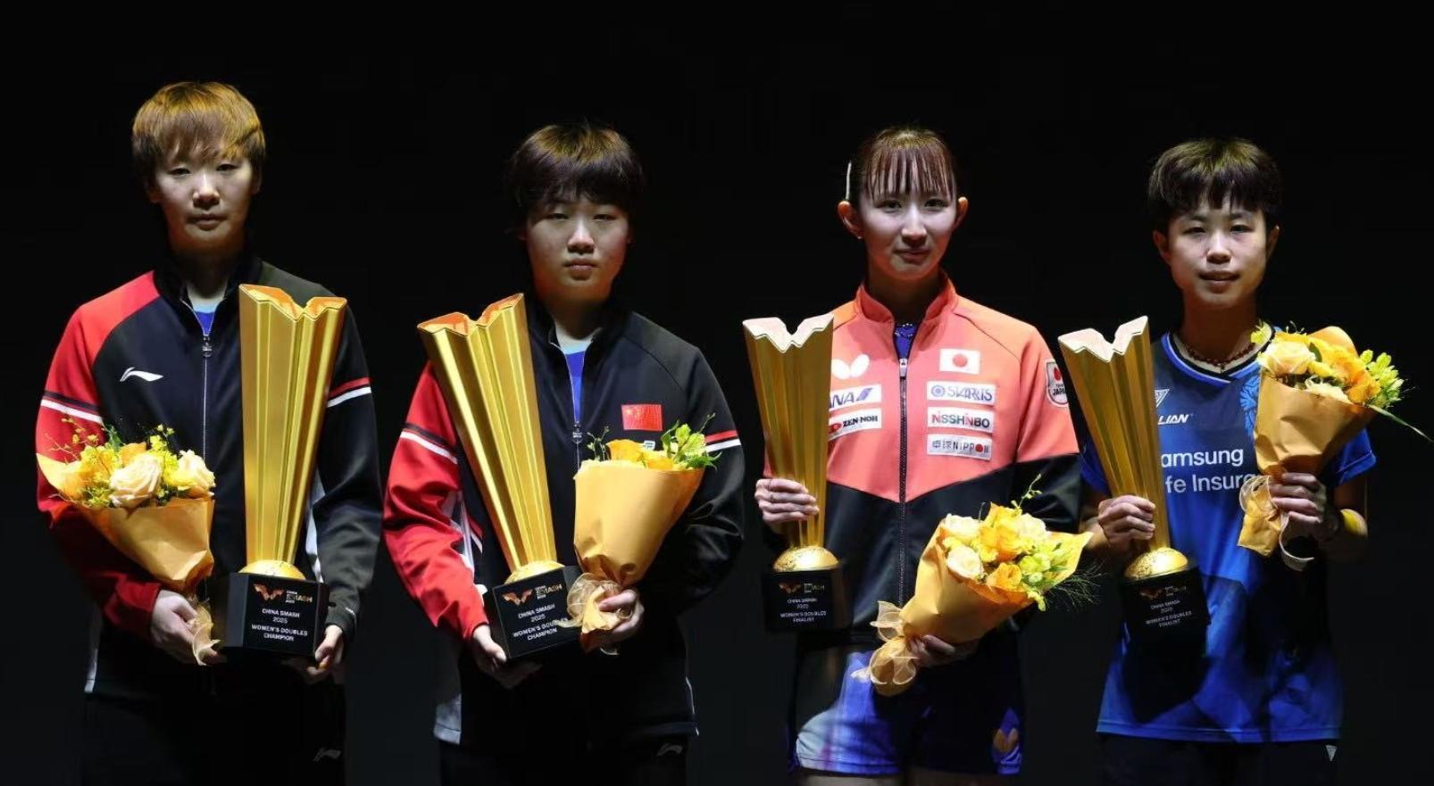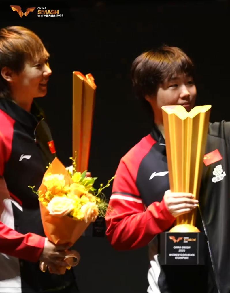 隨後就是頒獎典禮,不知道的還以爲早田希娜/朱芊曦是冠軍,大家可以看看王曼昱與蒯曼的表情,這兩人哪有奪冠的喜悅啊,反而是亞軍早田/朱芊曦嘴角上揚在笑,蒯曼、王曼昱一直黑臉。