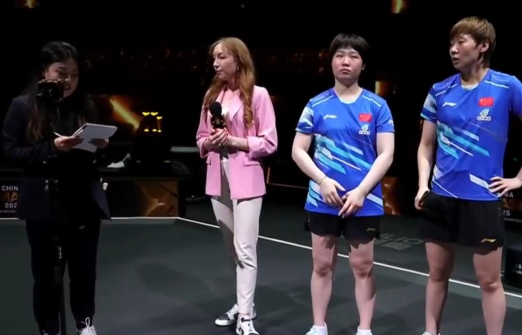 奪冠后王曼昱/蒯曼兩人臉上看不到一點喜色,也沒有對奪冠的興奮,王曼昱在接受採訪時立馬就反省了:雖然這次拿到了冠軍,但我跟蒯曼還有很多值得總結的地方,這場比賽蒯曼的狀態並不是很好,但雙打是一對組合,有時候就要一個人去扛更多,一個人犧牲更多,能夠贏下來對於我們來說非常好,謝謝大家爲我們加油。
