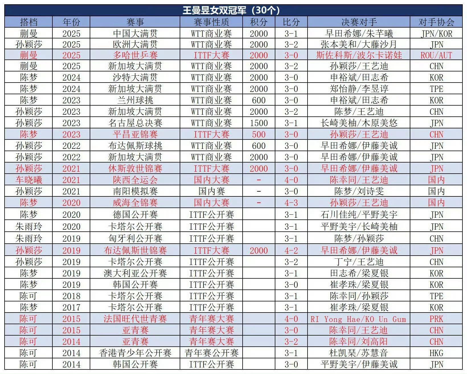 據悉王曼昱已經拿到了第30個女雙的冠軍,她跟陳可、陳夢、朱雨玲、孫穎莎、蒯曼都搭檔過,鐵打的王曼昱流水的搭檔。