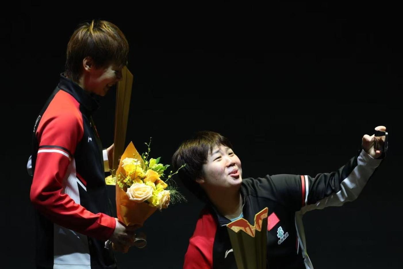 到了最後的自拍環節,蒯曼/王曼昱才終於露出了笑容,看王曼昱笑的多麼燦爛,這纔是屬於冠軍的時刻。