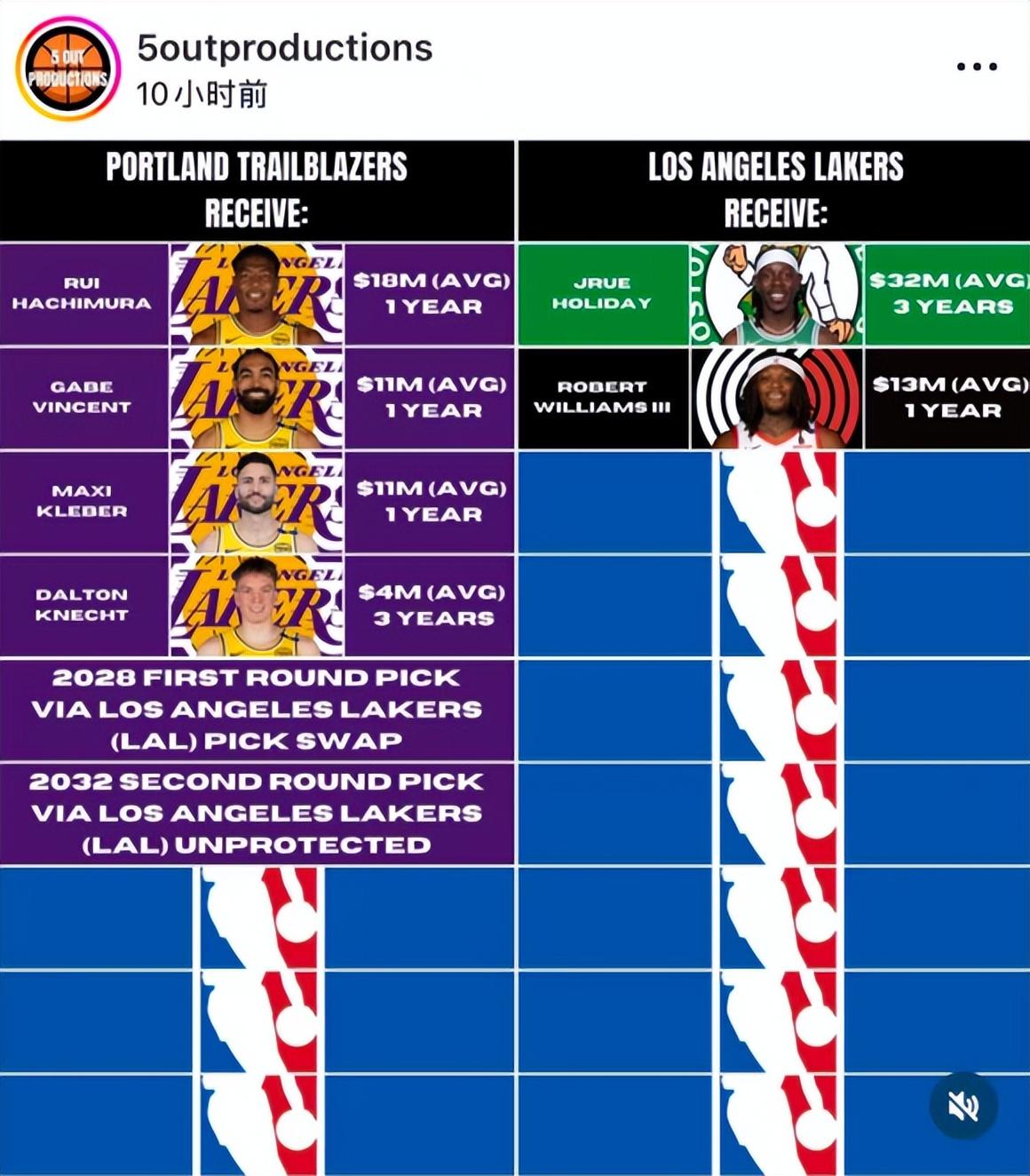 美媒建議湖人送出八村壘、文森特、克勒貝爾、克內克特、2028年首輪互換權、2032年不保護首輪從開拓者換來朱-霍勒迪與羅伯特-威廉姆斯。