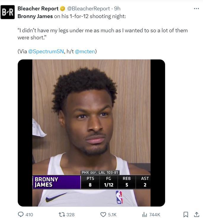 賽後布朗尼對自己的12中1找足了藉口:我覺得我沒有勉強出手,也沒有倉促出手,我就是感覺腿部力量有問題,腿部力量沒有達到最好的狀態,所以導致我的很多出手都短了一點。