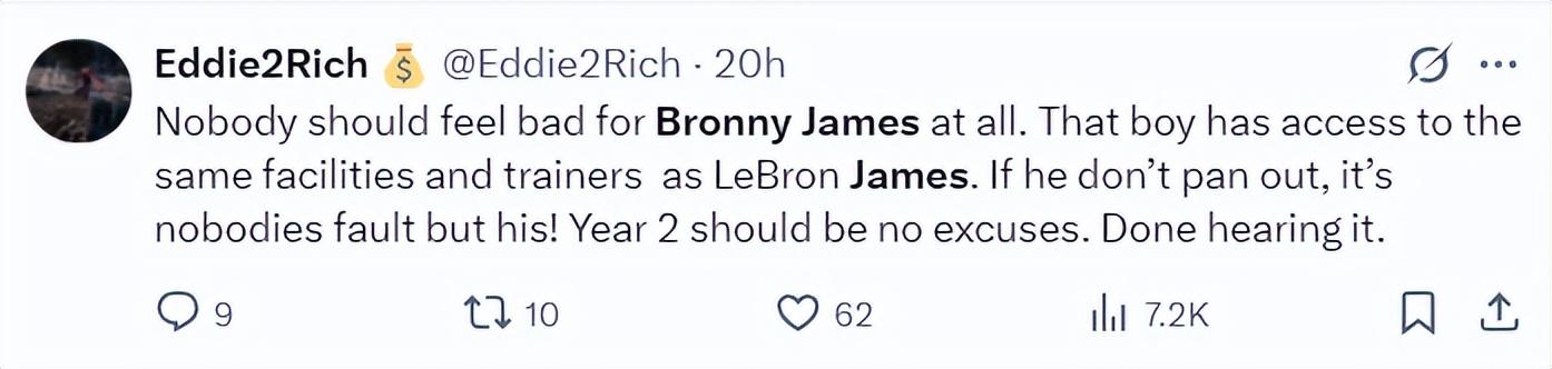 只可惜美媒Eddie2Rich並不買賬,他賽後炮轟:任何人都不該爲布朗尼-詹姆斯說話。那個孩子跟勒布朗-詹姆斯使用的資源是一樣的,訓練設備、訓練師。如果布朗尼沒成功只能怪自己不夠努力!第二年了,別再找藉口了,我們都聽夠了。