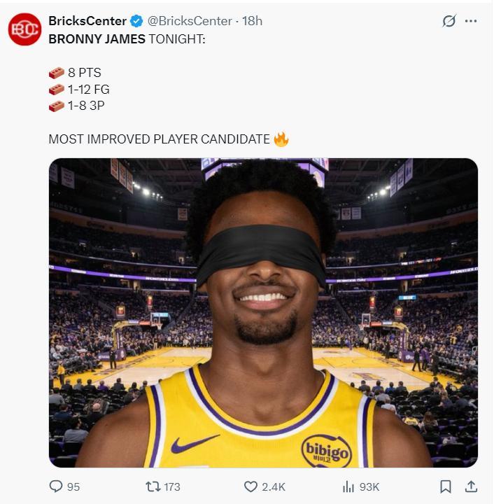 布朗尼在夏季聯賽打得挺好,可季前賽首秀24分鐘,12中1,三分8中1,拿到8分5籃板2助攻2失誤,命中率8.3%,三分命中率12.5%。(克內克特10中2,三分7中1拿6分6籃板2失誤)布朗尼與克內克特堪稱湖人新版臥龍鳳雛。