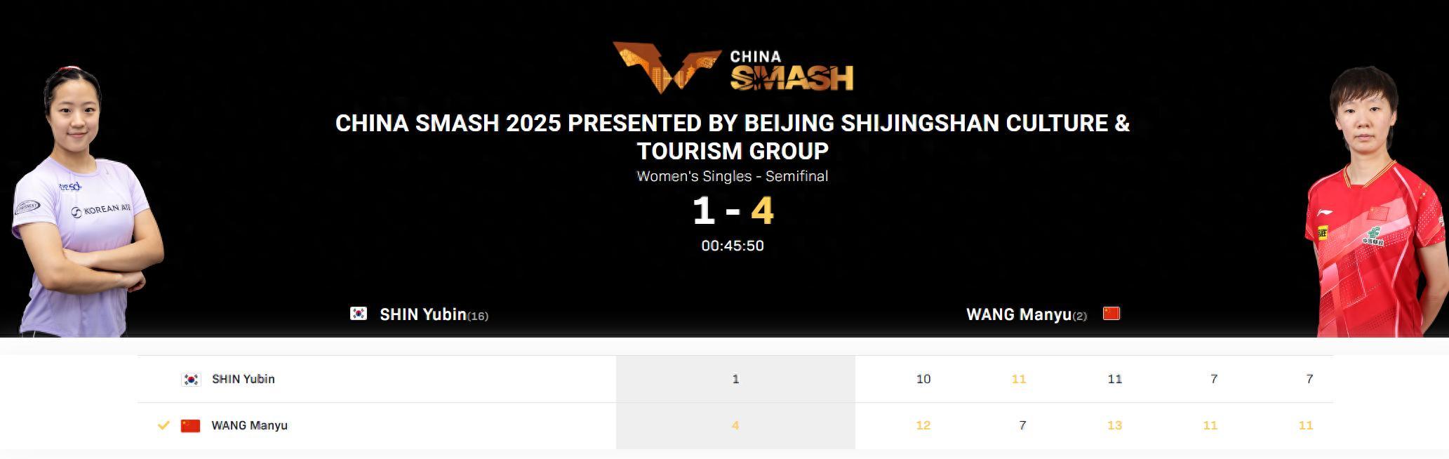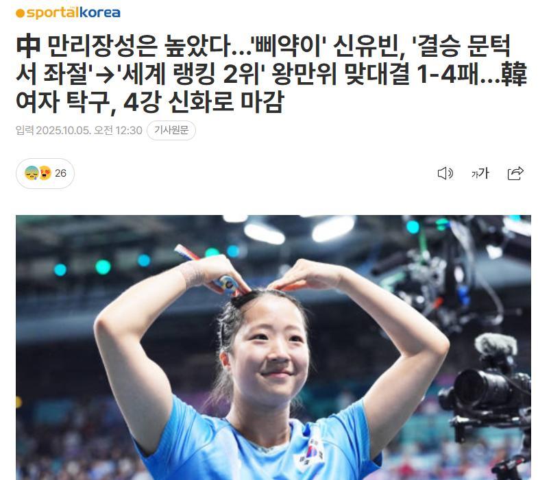 韓國媒體《SportalKorea》賽後發文:中國成長很高,申裕斌在半決賽受挫無緣決賽,面對世界排名第二的王曼昱1-4敗北,北京大滿貫女單以4強神話結束。