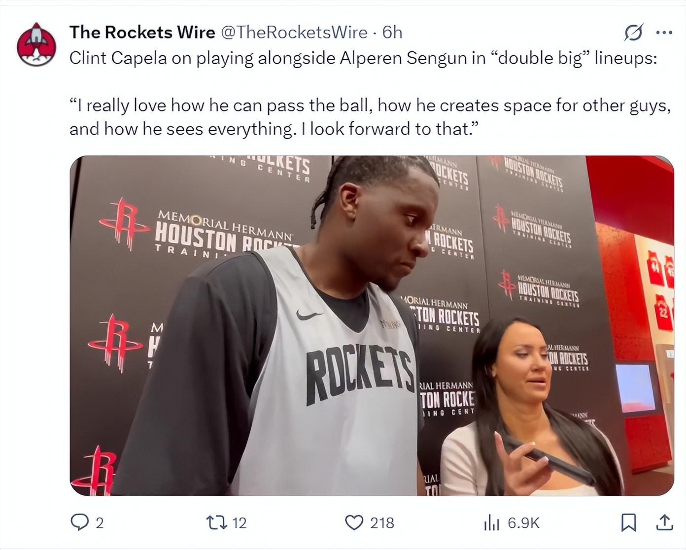 卡佩拉在採訪中談到雙塔戰術(與申京搭檔)的情況:申京太出色了,我非常欣賞他的傳球能力,他可以爲隊友創造空間,他對比賽的全局洞察力很驚人。