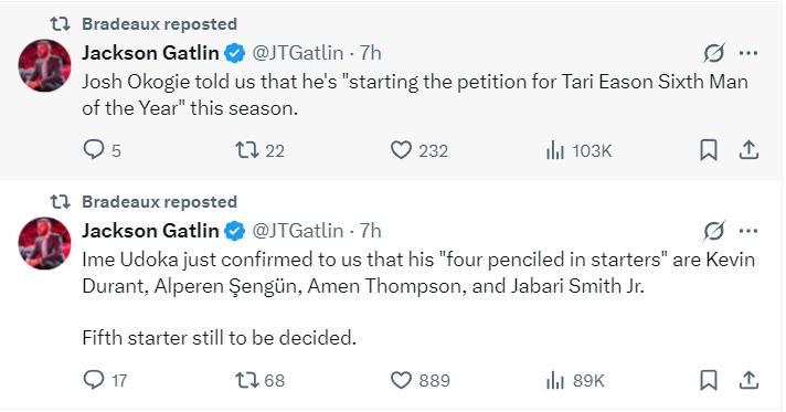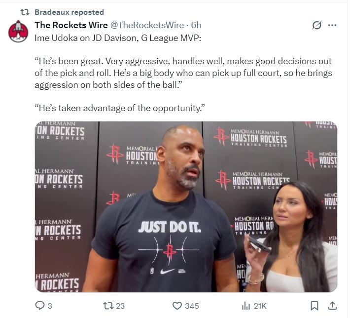 烏度卡除了重申只確定四個先發以外,他還盛讚了雙向合同球員戴維森,他說道:JD是G聯賽的最有價值球員,他在訓練營表現很出色,進攻積極性很高,控球能力也不錯 ,擋拆配合中可以做出明智的選擇。身材高大、能掌控節奏,攻防兩端極具侵略性,他抓住了這個機會。(也許是進入一號位輪換的機會)