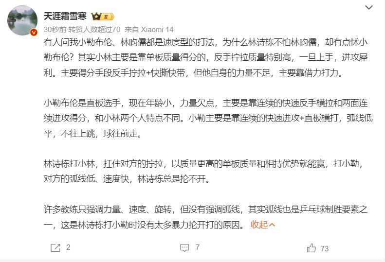 小勒布倫世界排名第七,林詩棟世界排名第二,這場比賽小勒布倫還是逆轉取勝,他在大比分1-2落後的情況下連贏三局,林詩棟後面三局整個士氣都被打沒了,他的正手擰拉拿不到分後非常慌亂,而小勒布倫的快速攻防轉換越打越流暢。