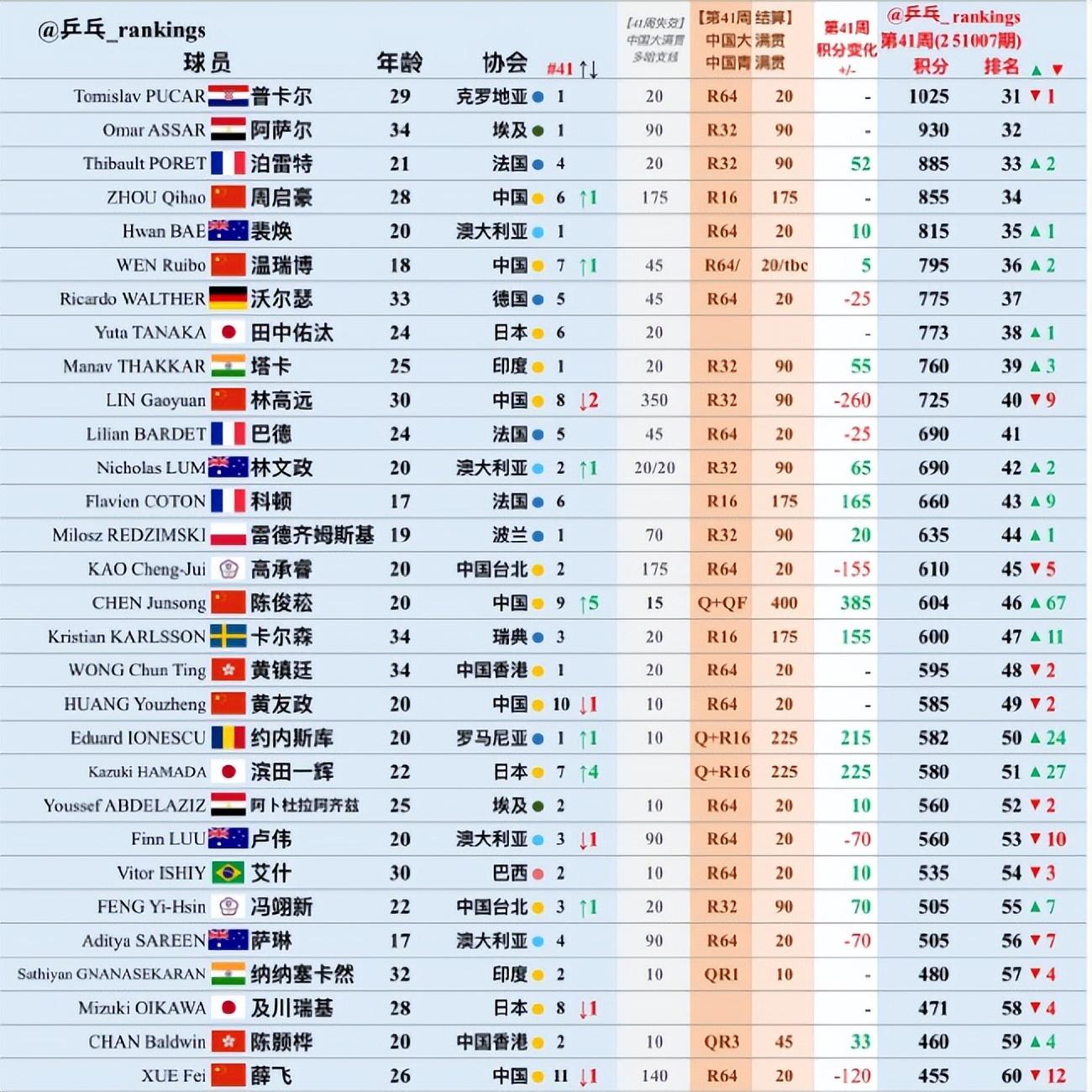 周啓豪+52升至第33位,林高遠-260跌至第40位(未來可能會逐漸淡出WTT舞臺),20歲的陳俊菘從世界排名113提升到世界排名第46(暴漲67個位次),薛飛-120直接跌到世界排名第60位。