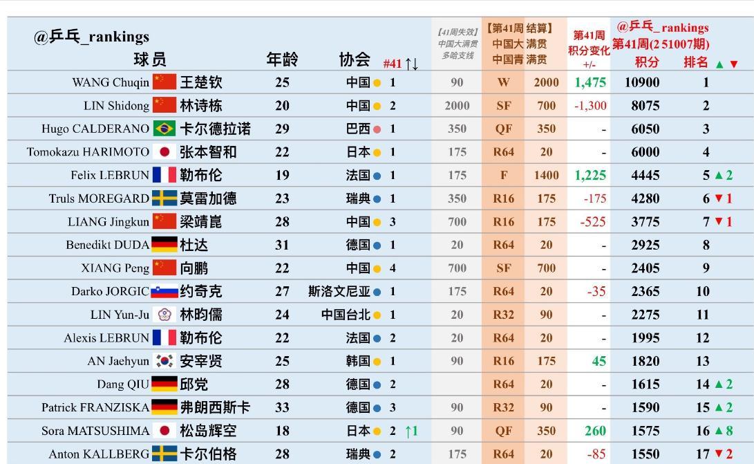 林詩棟去年北京大滿貫奪冠,今年是四強所以-1300,他8075還是世界第二。小勒布倫+1225升至世界第二,莫雷加德跌第六,梁靖崑跌第七。