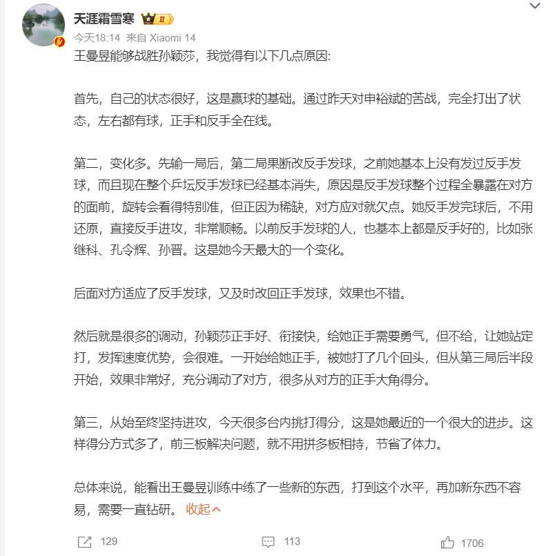 大V則分析了王曼昱贏球的三個要點,他寫的實在是太多,我直接精簡: