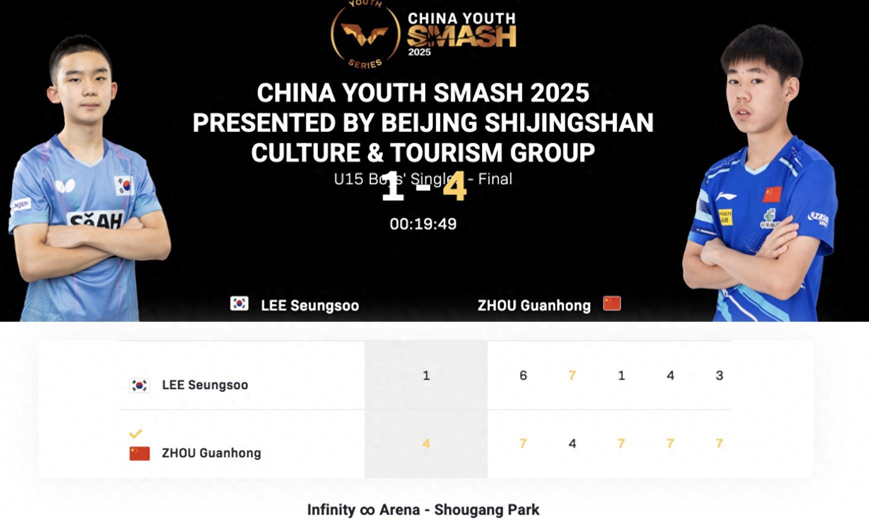 在9月7日,WTT青少年球星挑戰賽斯科普里站U15男單1/4決賽上,當時周冠宏2-3不敵李承洙,五局比分:11-13,11-8,11-13,11-6,10-12。那場比賽周冠宏一度0-2落後拖入決勝局,只可惜決勝局關鍵兩分未能拿下,換言之時隔一月周冠宏完成了對李承洙的復仇。