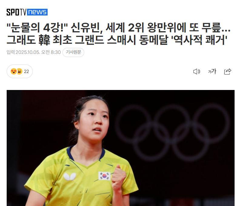 韓媒《SpotvNews》發文總結了申裕斌本次北京大滿貫:眼淚的4強,申裕斌半決賽不敵世界第二,但拿到了韓乒大滿貫首個銅牌。【大滿貫不設立3-4排位賽,所以進入四強就等於收穫一個銅牌】
