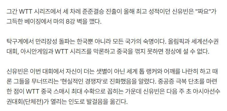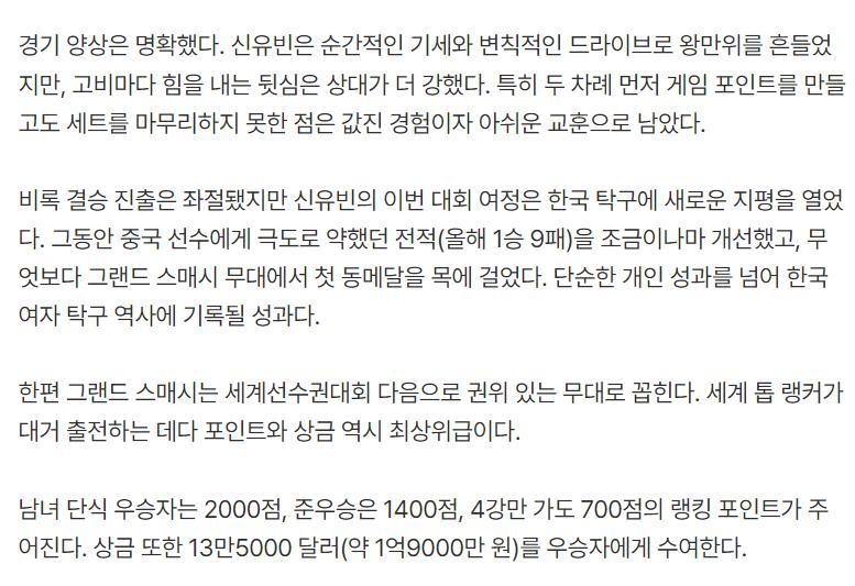 雖然申裕斌最終未能進入決賽,但她已經韓乒歷史首位進入WTT大滿貫賽事四強的女單選手,她爲韓乒開啓了新的高度,對中國選手的連敗戰績也得以改善,獲得700積分後她的世界排名也將反超日乒選手早田希娜升至第13位,值得一提的是WTT大滿貫賽事是被視爲僅次於世乒賽的權威舞臺,申裕斌證明了自己。