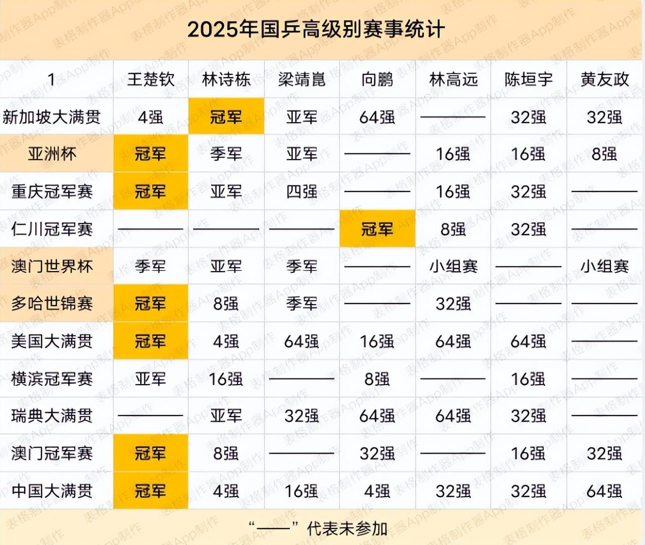 2025年對於王楚欽來說是豐收的一年,男單:亞洲盃冠軍、重慶冠軍賽冠軍、多哈世乒賽冠軍、澳門冠軍賽冠軍、中國大滿貫冠軍。疲勞但有收穫,這可能就是運動員爲之努力的一切吧。