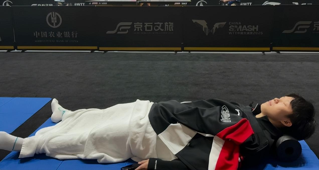 男單半決賽是安排在中午12點45分,這場比賽王楚欽與向鵬打到7局耗時47分33秒,王楚欽是在大比分0-2落後、1-3落後的情況下得以逆轉,他非常之疲勞,在這場半決賽後有媒體拍到王楚欽直接睡在了球館裏,王楚欽即刻的午睡也是他下午男單決賽能有體能的關鍵。