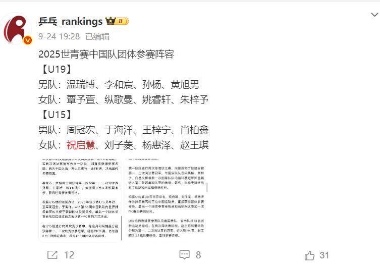 今年11月23日-30日在羅馬尼亞舉行的U15世青團體賽祝啓慧就是絕對核心,她是U15國少世界排名最高的選手,周冠宏是男團的絕對核心。希望祝啓慧能繼續帶隊奪冠,今年的亞青賽她帶領U15女團拿了冠軍。