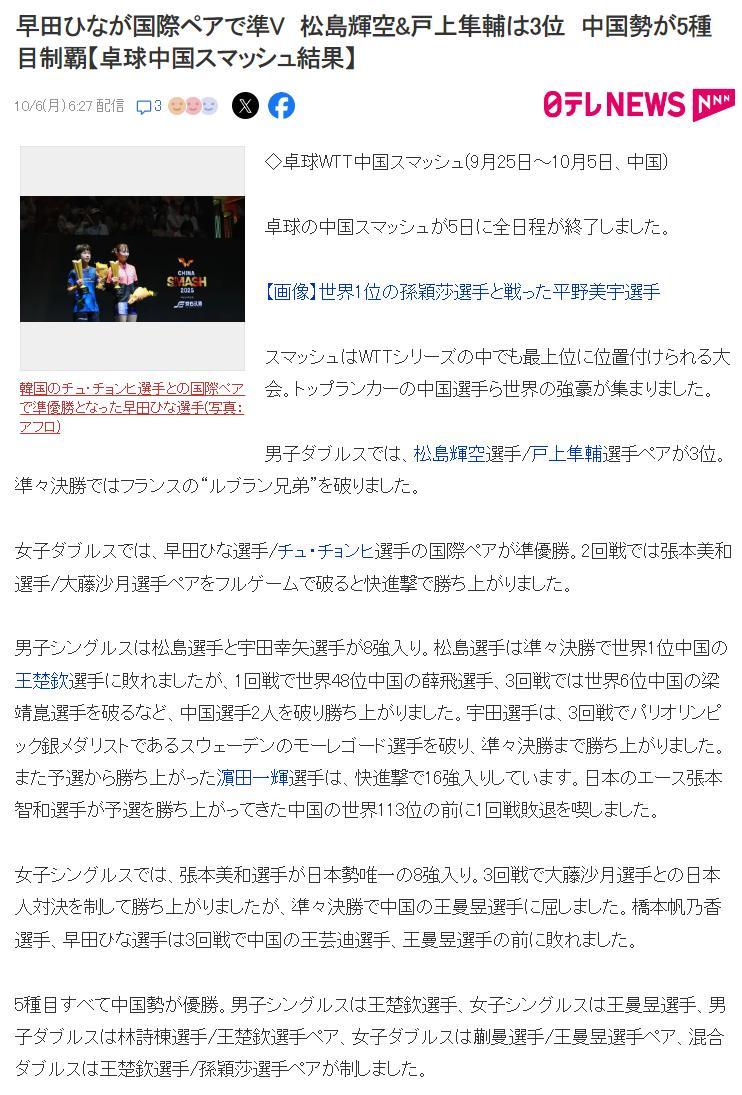 北京時間10月6日晨,日本媒體總結了WTT北京大滿貫,文中寫道中國隊包攬了五項冠軍:男雙、女雙、男單、女單、混雙,日本隊只有早田希娜一人獲得女雙亞軍的榮譽。日本乒協派出龐大的陣容卻斬獲寥寥。