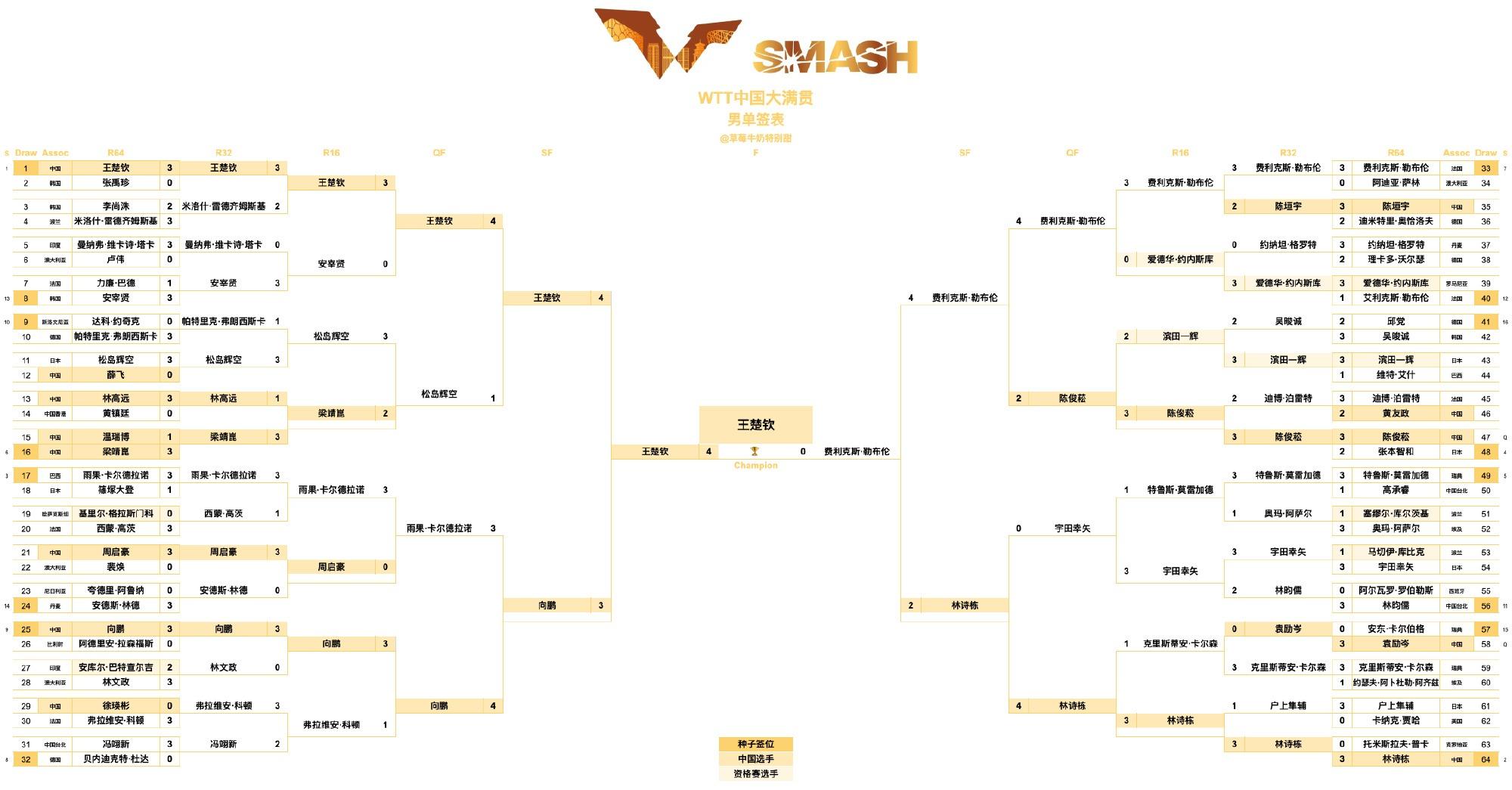 男單項目更爲慘烈,日乒男單排名最高的張本智和在首輪被中國世界排名113的20歲陳俊菘淘汰止步64強;松島輝空1-4王楚欽止步八強,篠塚大登1-3雨果止步64強,戶上隼輔1-3林詩棟止步16強,宇田幸矢0-4林詩棟止步八強,濱田一輝0-4陳俊菘止步16強。