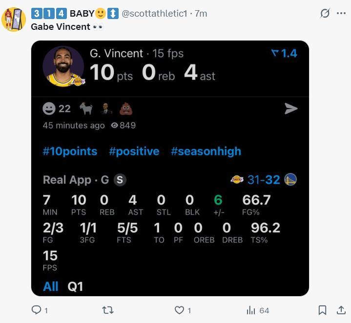 文森特一下場湖人就崩了,湖人最後三分鐘是一分沒得,勇士在穆迪、希爾德的發揮下就完成了反超。第三節湖人的主力登場打了6分鐘毫無戰意可言,文森特這一節2中0,三分1中0只送出1個助攻,湖人第三節直接崩盤了。