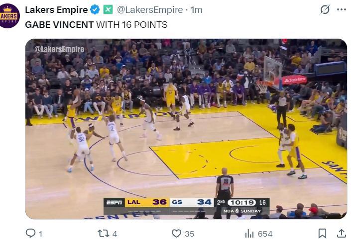 北京時間10月6日,NBA季前賽,湖人VS勇士,文森特復出的上半場打出了完美表現,短短11分鐘就拿到16分,但他下場後湖人崩盤了,第三節開場湖人全隊都鬆鬆垮垮沒有戰意,文森特第三節也很快被換下,他首秀16+5+3三分真的很不錯了。