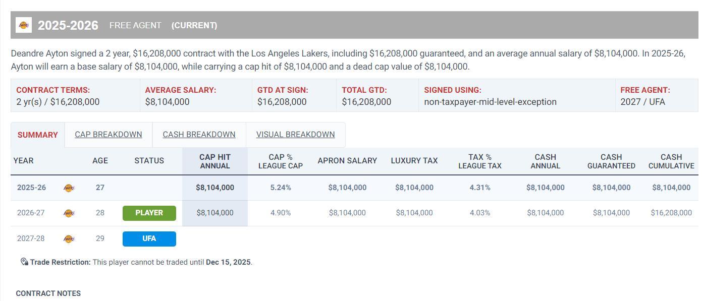 湖人今夏是以兩年1620萬的合同簽下他,這份合同下賽季薪水爲810萬,26-27賽季是810萬,這份合同沒有球隊選項與球員選項,可全額保障,一開始都覺得湖人低價簽下27歲的前狀元艾頓贏麻了,可當艾頓登場才知道,他跟聯盟頂級的內線差距有多大。