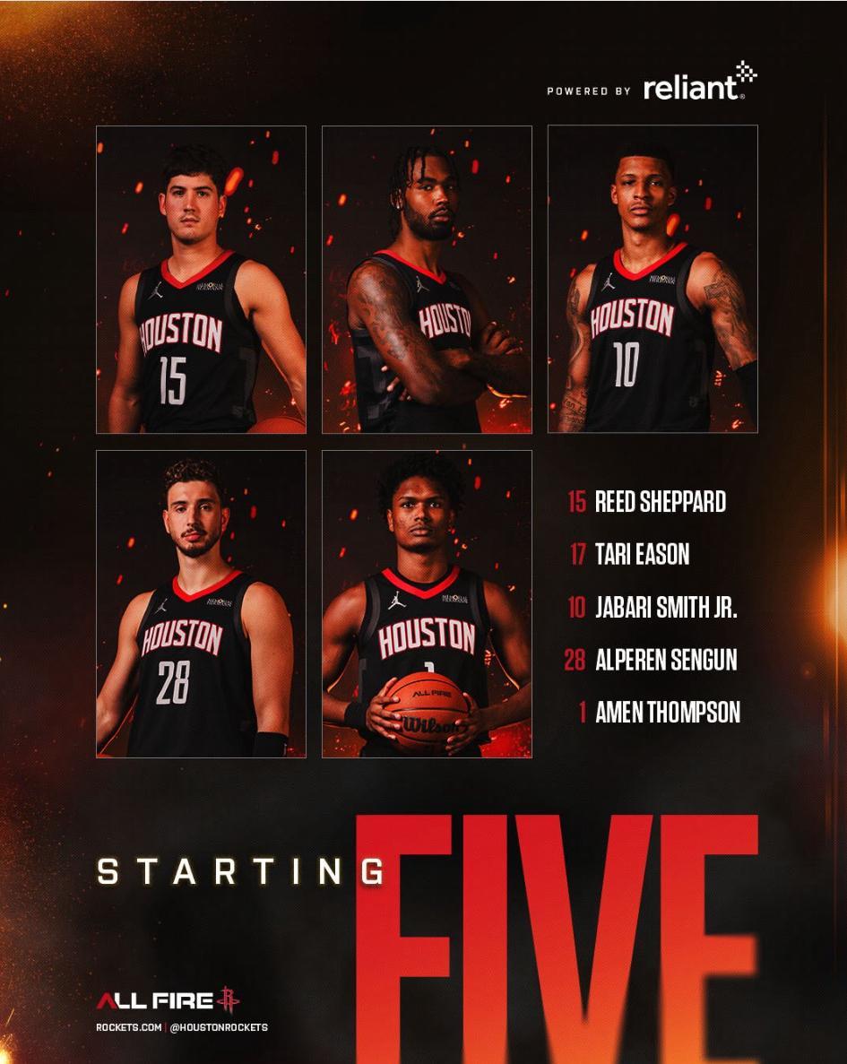 凱文-杜蘭特並沒有像一天之前火箭隊記透露的那樣出戰第一場季前賽,這讓烏度卡調整了先發陣容,謝潑德、伊森都進入先發陣容,目前烏度卡還沒有確定先發五人的最後一個席位,所以謝潑德與伊森是競爭關係,而這套陣容的第一核心就是申京。
