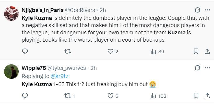 美球迷:庫茲馬絕對是聯盟最愚蠢的球員,加上他糟糕的表現,他成爲聯盟最具威脅的球員之一,他這種威脅是針對自己的球隊,看起來庫茲馬是聯盟最差的球員之一。