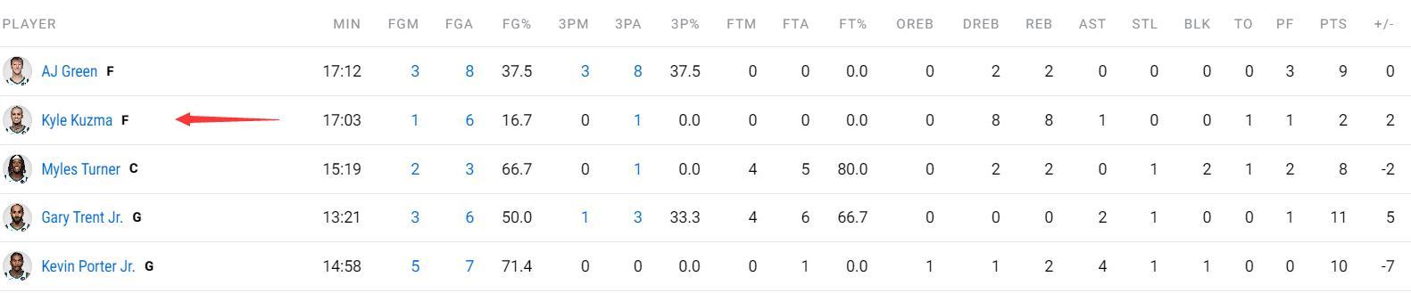 作爲球隊的先發大前鋒,全場比賽17分鐘,6中1,三分1中0,拿到2分8籃板1助攻1失誤,命中率16.7%。最離譜的是在籃下出手了4次只命中一球,上籃都上出了一個過橋!庫茲馬這個狀態真是令人無奈。