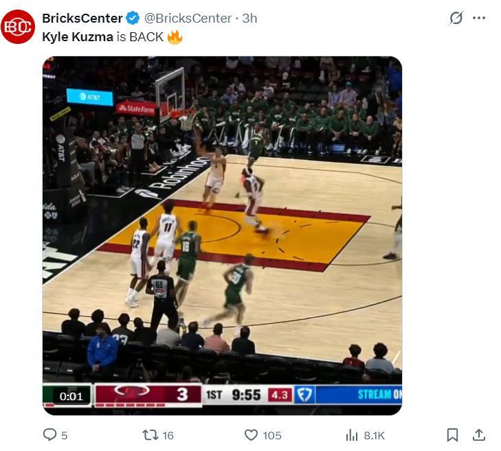 這場比賽首節開場庫茲馬命中第一個球后就開始了瘋狂的打鐵、三不沾之旅,這一球他面對威金斯後仰中投直接來了一箇中投三不沾,雄鹿替補席都沒眼看,現場有噓聲出現。