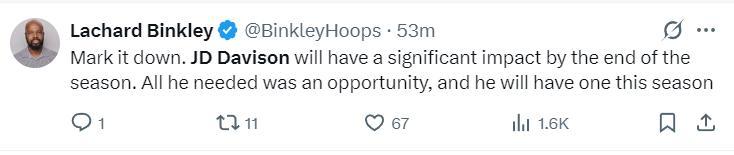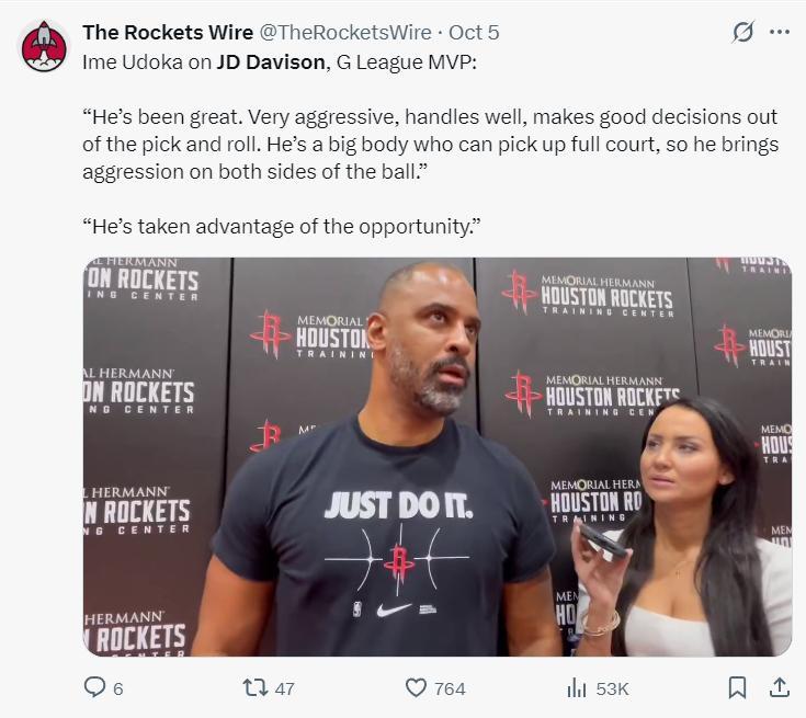 火箭隊記蘭德里-賓克利暗示賽季末會轉正戴維森,他寫道:等着看吧,傑德-戴維森在本賽季末將產生重大影響,他所需要的只是一個機會,而這個機會本賽季他就能得到。
