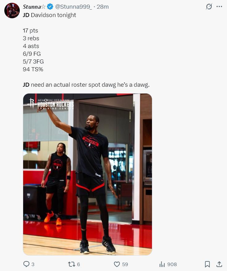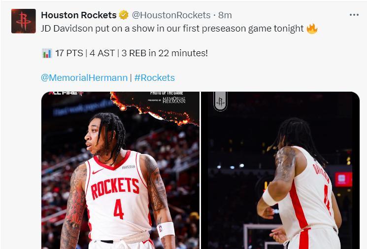 火箭官方:JD-戴維森代表火箭的賽季首秀非常出色,22分鐘拿到17+5個三分球。