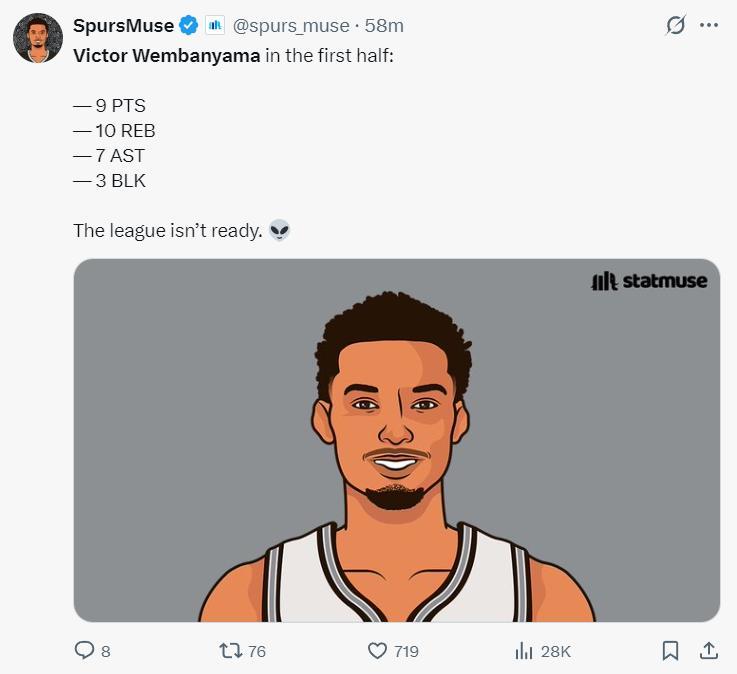 文班亞馬第二節命中一個三分球,單節送出兩個大帽,3分2籃板4助攻2蓋帽1失誤,文班亞馬這場比賽唯一的話柄就是失誤過多。