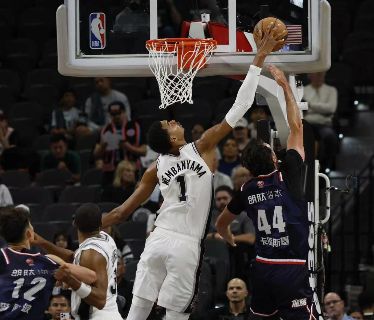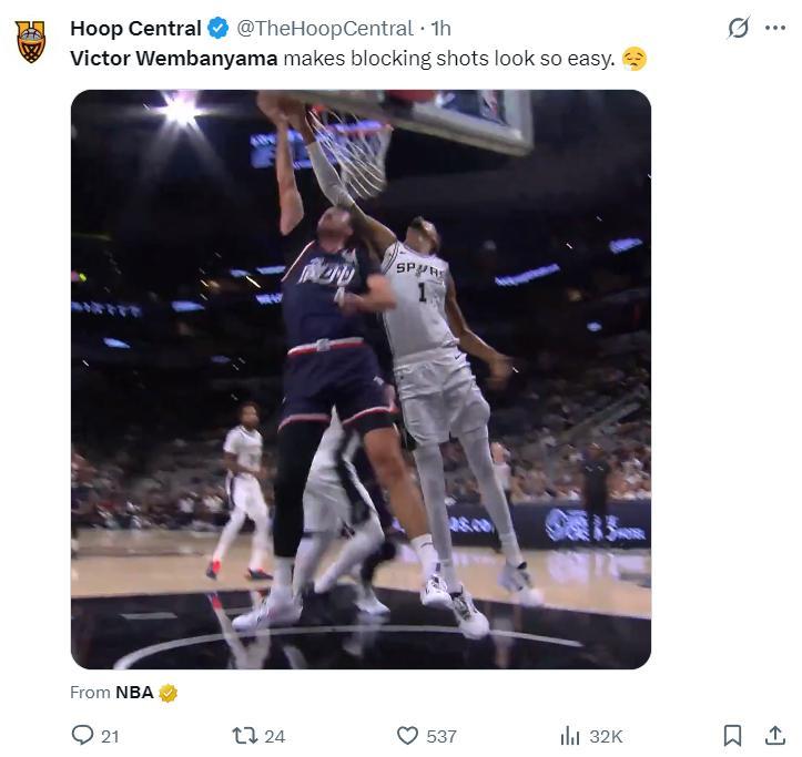 因爲馬刺這邊索漢、福克斯、卡斯爾等多位主力不打,文班亞馬成爲馬刺唯一的亮點,文班亞馬首節就送了卡明斯基一個大帽,卡明斯基這個球都已經過了文班亞馬一個身位還是被帽掉了!首節文班亞馬2中2拿6分8籃板3助攻1蓋帽5失誤。