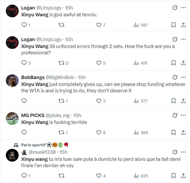 王欣瑜這樣的舉動也引發了外國球迷們的不滿:1.兩盤比賽出現了多次非受迫性失誤,王欣瑜算職業選手嗎?